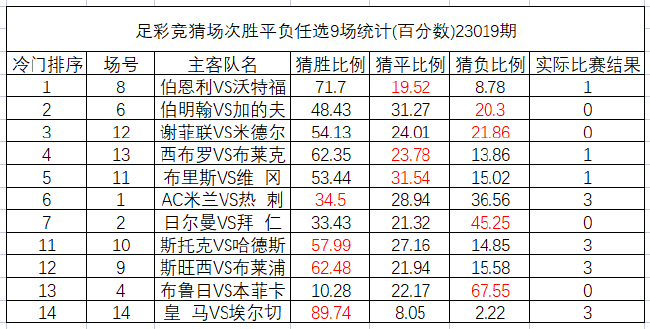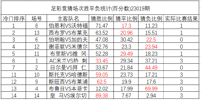 23019期足彩14场冷门排序